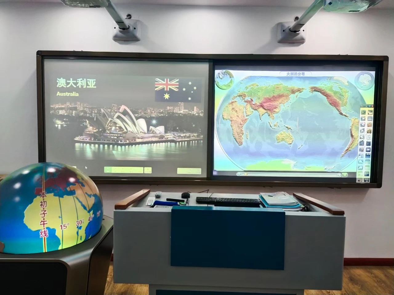 三間教室均配有數(shù)字立體地形、多點(diǎn)觸控多媒體球幕投影演示儀、天文演示儀以及數(shù)字模型等設(shè)備。學(xué)校老師精于鉆研,很快便能熟練使用各設(shè)備,并應(yīng)用于日常教學(xué)。